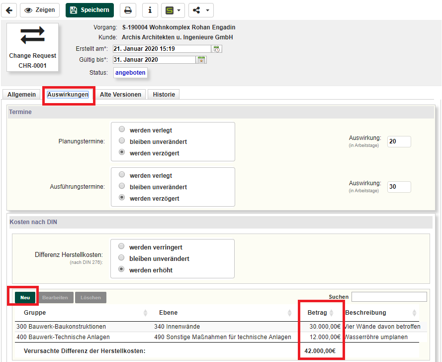 Schritt 10: Tragen Sie die voraussichtlichen Auswirkungen der Änderung auf die Baukosten und Bautermine unter der Lasche „Auswirkungen“ ein. Hierbei werden sowohl die Kosten gemäß DIN als auch mögliche Verzögerungen berücksichtigt.