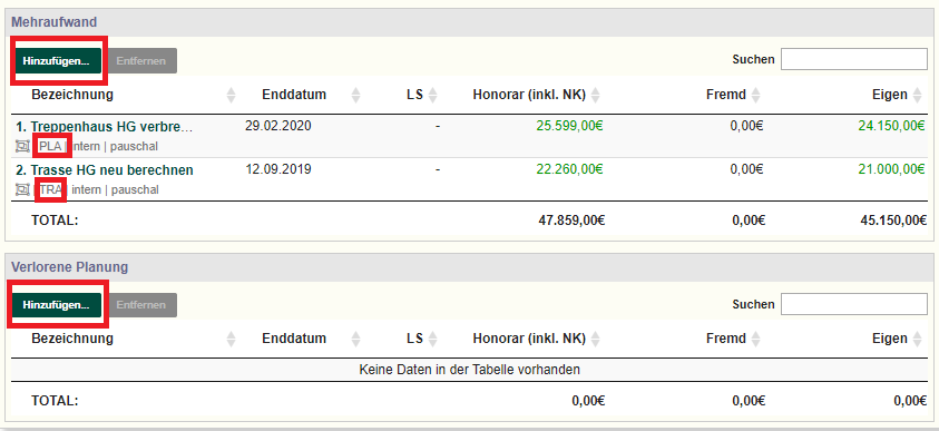 Schritt 9: Unter „Mehraufwand“ bzw. „Verlorene Planung“ wählen Sie die Leistungen/Positionen aus, die dem Änderungsantrag zugewiesen werden sollen.