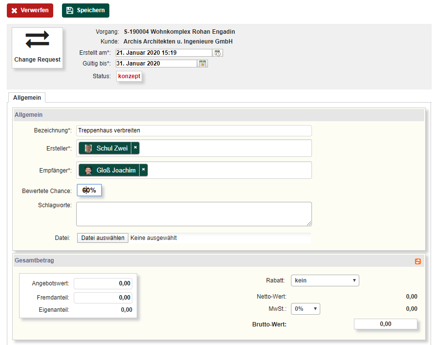 Die Berechtigung zur Erstellung, Löschung oder Bearbeitung eines Änderungsantrags ist auf Mitarbeiter mit Vertriebs- und Projektleitungsrechten beschränkt.
