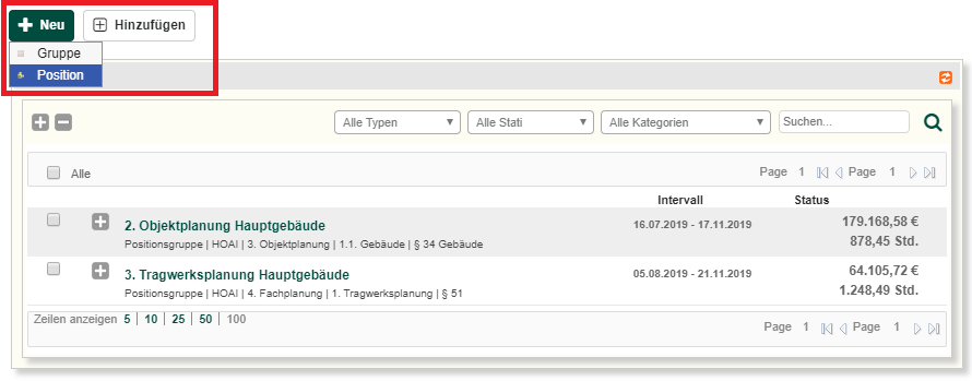 Die Entscheidung, ob eine Positionsgruppe als "allgemein", "HOAI" oder "periodisch" eingestuft wird, wird in der entsprechenden Positionsgruppenmaske getroffen. In der obigen Abbildung wurden bereits zwei Positionsgruppen vom Typ "HOAI" erstellt ("Objektplanung Hauptgebäude" und "Tragwerksplanung Hauptgebäude").