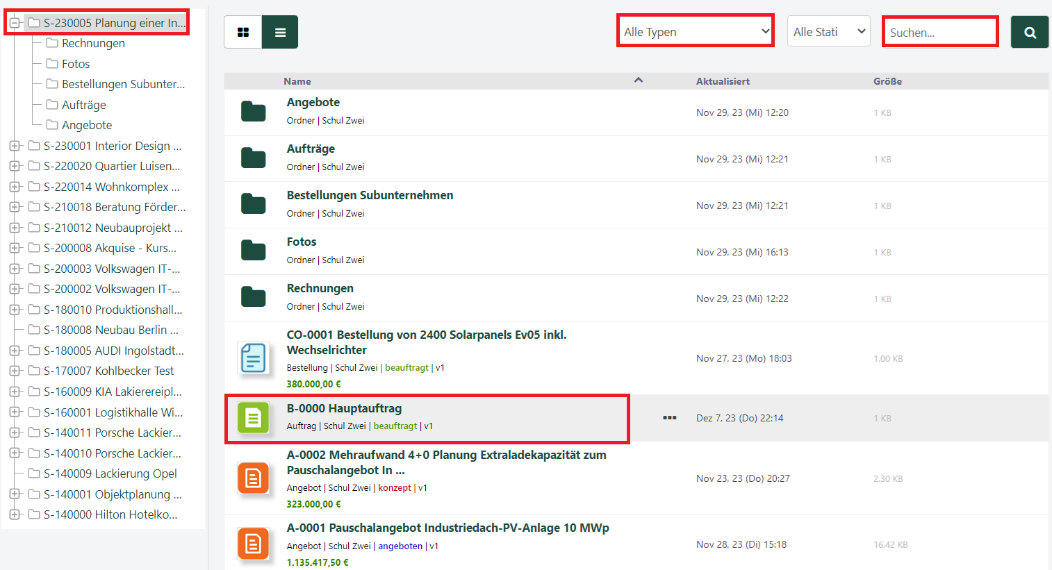 Wählen Sie den Auftrag /die Beauftragung aus, für die das Honorar eingeplant werden soll. Der Auswahl der Beauftragung findet unter dem jeweiligem Kaufmänischem teil des Projektes, Lasche Dokumente.
