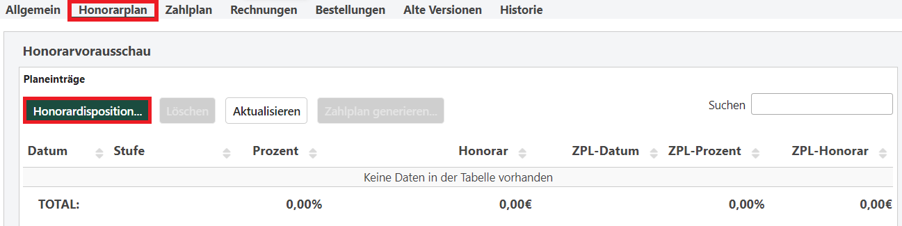 Wählen Sie die Lasche Honorarplan aus und setzten Sie das Dokument in Bearbeiten. Die Honorardispositionsmaske wird angezeigt.