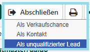 Aktion ausführen: Klicken Sie auf den Button "Abschließen" in dem oberen Menü und wählen Sie die Option "Als Verkaufschance" oder "Als Kontakt" wenn der Lead Potential ausweist.
