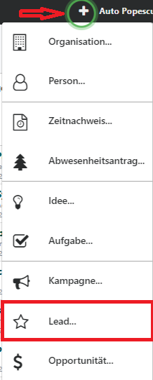 Klicke auf das Symbol "+" in der obersten Leiste, wähle die Option "Lead" aus, um ein neues Dokument anzulegen.