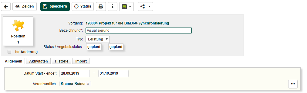 Datum Start / Ende: Geben Sie die Start- und Enddaten für die Position ein. Diese Informationen sind entscheidend für die zeitliche Planung und Verfolgung der Leistung.