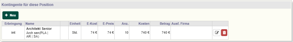 Die voraussichtlichen Kosten werden aufgrund der in den "Kontingenten für diese Position" festgelegten Werte berechnet und mit dem Budget verglichen.