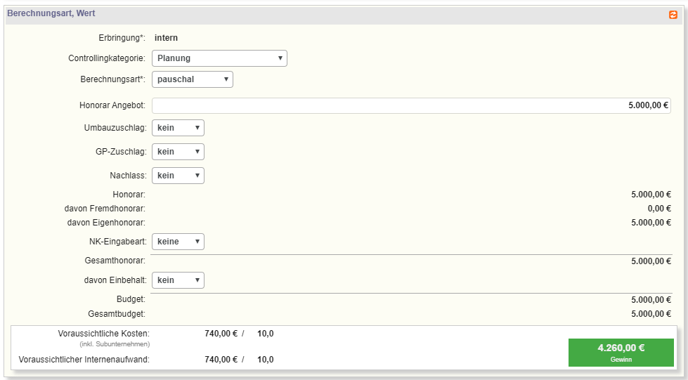 "pauschal"- Für pauschale Positionen kann in "Honorar Angebot" der Wert der angebotenen Position eingetragen werden.