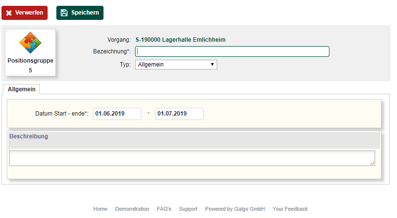 Eine Positionsgruppe dient einer besseren Struktur des Prozesses (z.B. des Projektes) und fasst mehrere verwandte Positionen zusammen. Die Positionsgruppe hat eine Nummer, eine Bezeichnung und eine meistens auch eine Dauer (Start, Ende).