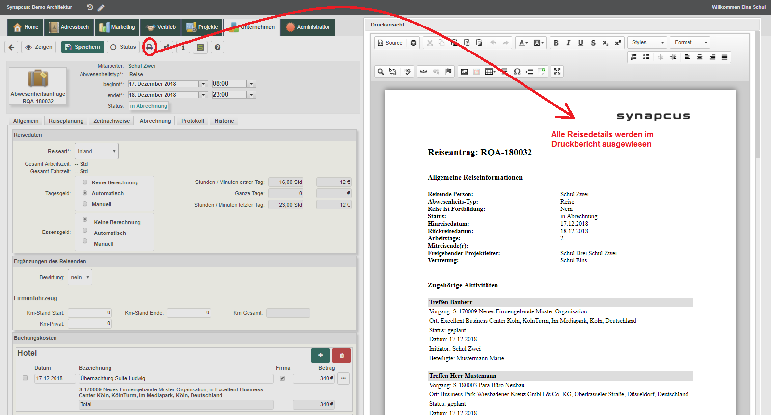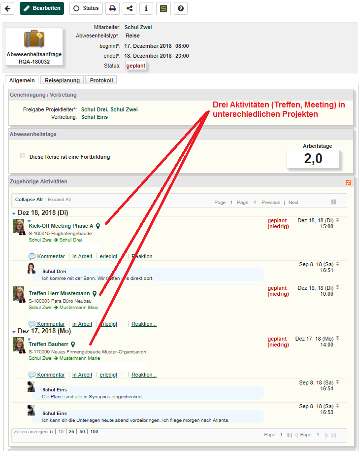 Die Reiseaktivitäten sind Aktivitäten vom Typ "Treffen" oder "To Do" und sind Kostenträger für die erstellten Reisen im Synapcus System