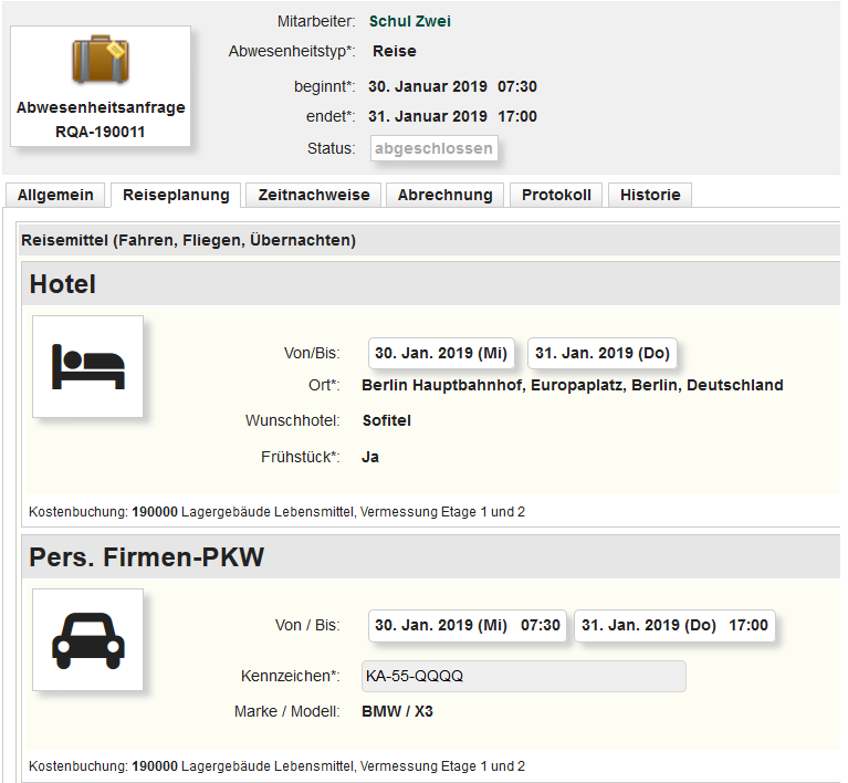 Ein Reiseantrag ist eine spezielle Form des Abwesenheitsantrags. Dabei entfallen Reise- und Arbeitskosten. Diese Zeiten werden positiv dem Mitarbeiter Stundensaldo angerechnet. Um eine Dienstreise anzutreten, bedarf es eines Reiseantrags der vom Projektleiter freigegeben werden muss.