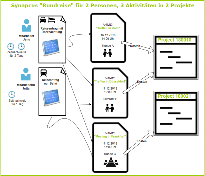 Eine Rundreise beinhaltet Reiseziele und Ansprechpartner aus mehreren Projekten / Prozessen. So kann z.B. eine Reise nach Köln, Düsseldorf und Frankfurt die Projekte 180010 und 180021 betreffen. Die Reisekosten werden entsprechend auf diese 2 Projekte (Kostenstellen) verteilt. Die Verteilung der Kosten erfolgt mittels der "Aktivität" (die z.B. ein "Treffen" oder "ToDo" sein kann). Auch die Reise- bzw. Arbeitszeiten werden auf diese Reiseaktivitäten eingetragen.