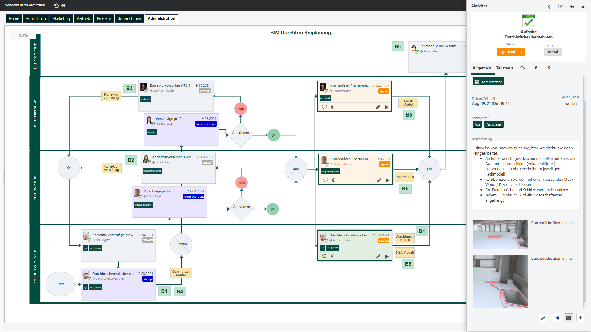 Ein klarer, automatisierter BPMN-Workflow der die Schlitz- und Durchbruchsplanung auf mit Synapcus darstellen und effektiv ausführen/takten kann.