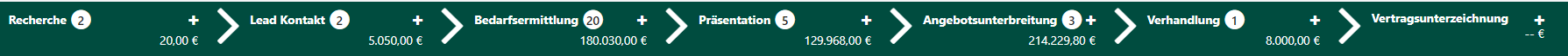 werden sorgfältig im Vertriebsprozess verfolgt und enthalten wesentliche Informationen zu potenziellen Projekten, Präsentationen, Angeboten, Akquisekosten, Machbarkeitsanalysen und Geschäftsabschlüssen.